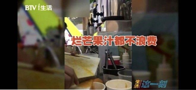 視頻中顯示,甘茶度工作人員手抓垃圾、徒手切水果,并且大量水果原材料已經腐爛變質,店員被要求將變質與非變質水果混搭使用,且當天沒有售出的茶、水果第二天繼續使用。