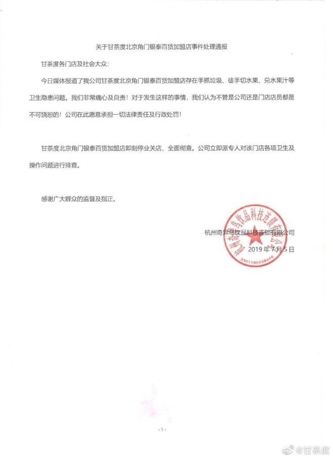 茶飲品牌甘茶度被曝存在嚴重衛生問題。7月5日,一條記者臥底甘茶度后廚期間發現存在用料不新鮮、操作不規范等問題的視頻引起熱議。關于媒體報道的甘茶度北京角門店存在的衛生隱患問題, 甘茶度官方微博發布《事件處理通報》表示,甘茶度北京角門加盟店即刻停業關店、全面徹查。
