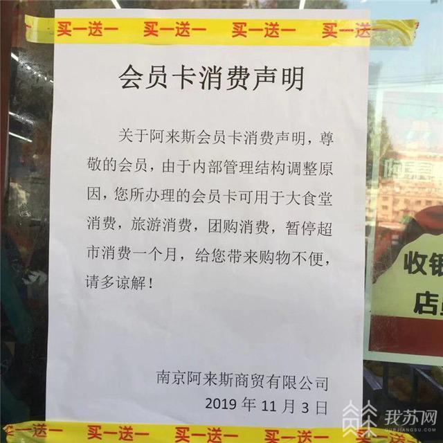 記者了解到,11月3日這家生鮮超市曾經(jīng)貼出一則會(huì)員停用通知,上面寫(xiě)道:阿來(lái)斯資金鏈斷裂不與超市結(jié)賬,負(fù)責(zé)人不露面解決問(wèn)題,所有會(huì)員暫停使用,等阿來(lái)斯負(fù)責(zé)人陶某露面解決賬務(wù)問(wèn)題再另行協(xié)商。阿來(lái)斯商貿(mào)公司負(fù)責(zé)人陶某告訴我蘇特報(bào)記者,超市突然關(guān)門(mén)是因?yàn)楣九c承包商出現(xiàn)了糾紛。