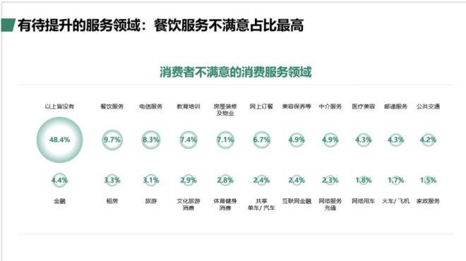 調(diào)查結(jié)果顯示,一半消費(fèi)者不滿意的服務(wù)領(lǐng)域,涉及衣食住行、學(xué)習(xí)工作、社交娛樂(lè)等。其中,主要與“吃”相關(guān)的服務(wù)占16.4%,包括餐飲服務(wù)和網(wǎng)上訂餐。從區(qū)域看,除了餐飲服務(wù)外,蘇南和蘇中地區(qū)對(duì)通信服務(wù)也較不滿意,而蘇北地區(qū)對(duì)教育培訓(xùn)和房屋裝修及物業(yè)較不滿意。