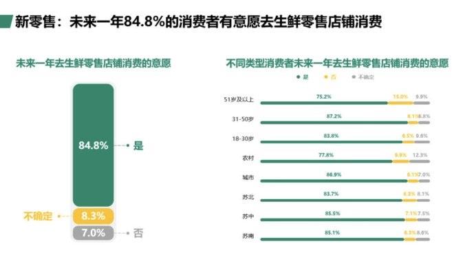 未來(lái),江蘇人對(duì)消費(fèi)有什么新期待?現(xiàn)代快報(bào)記者了解到,在生鮮新零售領(lǐng)域,有將近九成(84.8%)的消費(fèi)者表示,希望到生鮮新零售店鋪消費(fèi)。此外,希望增加生活類消費(fèi)場(chǎng)所,包括連鎖/大型超市、百貨/購(gòu)物中心,尤其是蘇中蘇北地區(qū)。