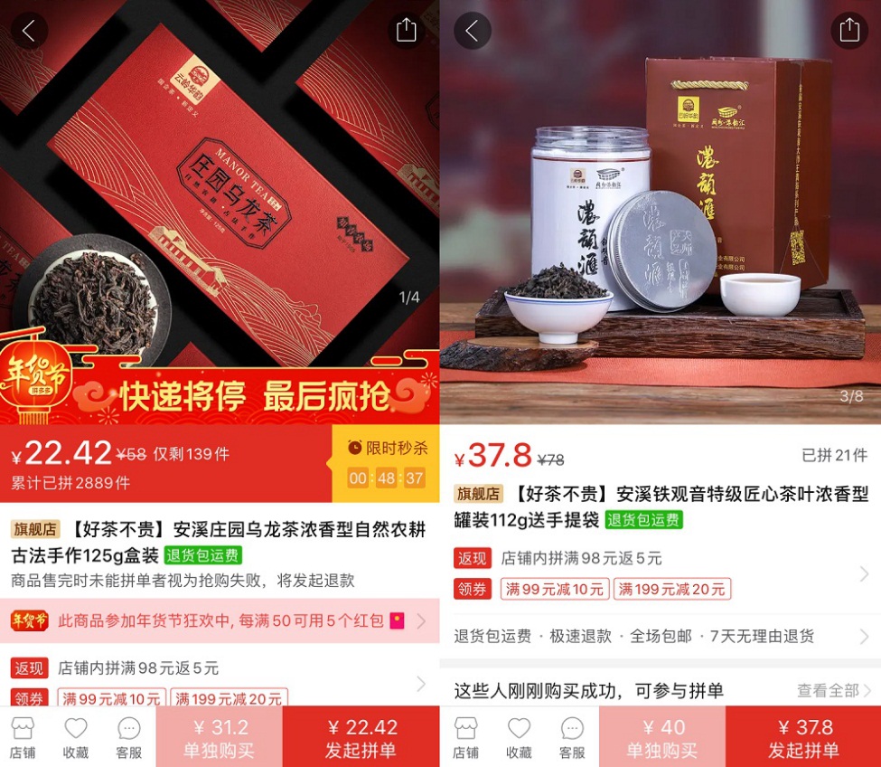 ▲云嶺茶葉帶來的莊園烏龍茶和大師鐵觀音,在拼多多年貨節期間,兩款產品還在原有價格基礎上推出了限時優惠。