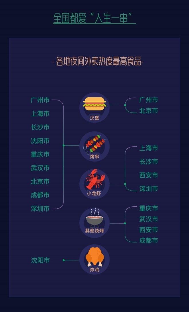 烤串成為多個城市美團用戶最愛的夜間外賣。面包甜點、小龍蝦、火鍋、奶茶等其他宵夜品類也有明顯增長,折算成等價食物,約等于北京人民吃掉33萬串烤串,武漢人民吃掉22萬串烤串,上海人民吃了24萬只小龍蝦,逛吃逛吃”成為夜晚首選。北京人民最愛三里屯,重慶人都去解放碑。