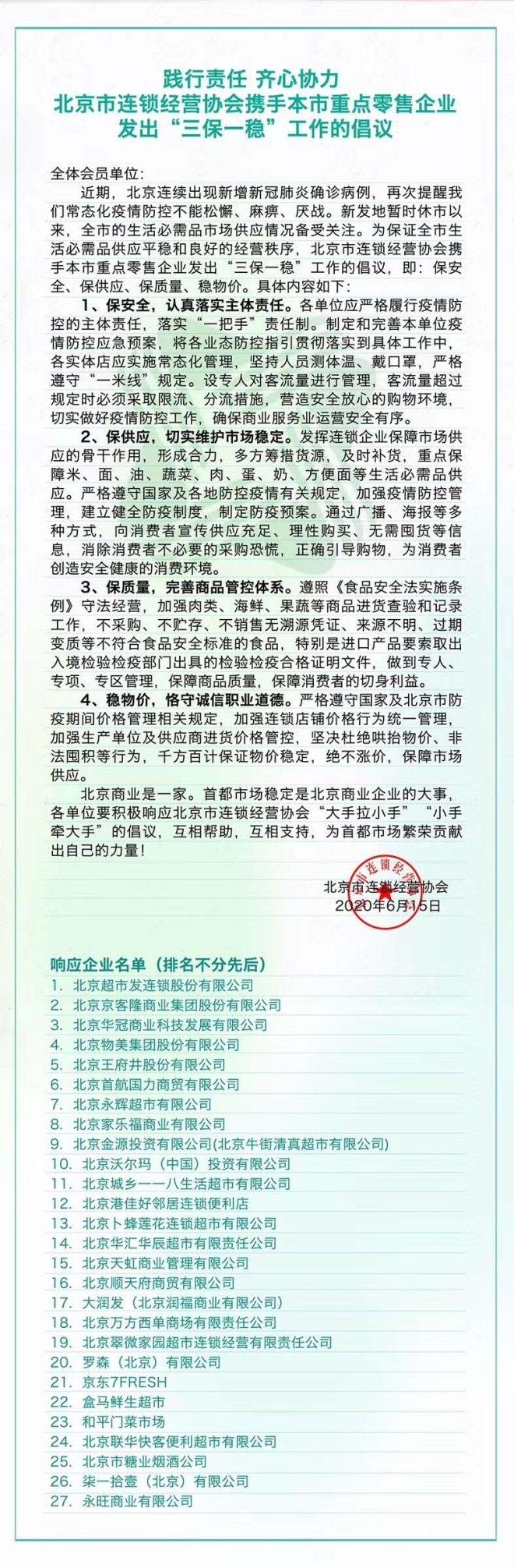 倡議二:《踐行責(zé)任 齊心協(xié)力北京市連鎖經(jīng)營協(xié)會攜手本市重點零售企業(yè)發(fā)出“三保一穩(wěn)”工作的倡議》