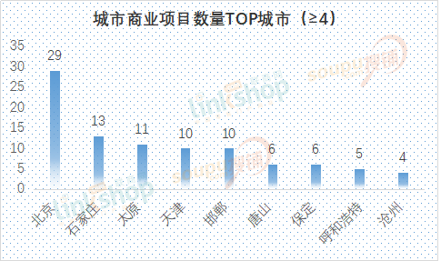 從各城市新增商業項目數量來看,新增4家及以上擬開業的城市有北京、石家莊、太原、天津、邯鄲、唐山、保定、呼和浩特和滄州。其中,作為省會城市,石家莊擬新開業項目達13家,太原擬新開業項目達到11家。這些上榜城市多為直轄市、省會城市或者省級副中心城市。
