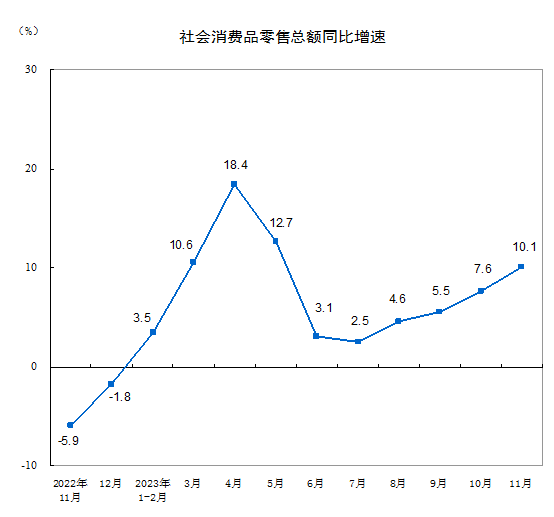2023年11月份社會消費品零售總額增長10.1%