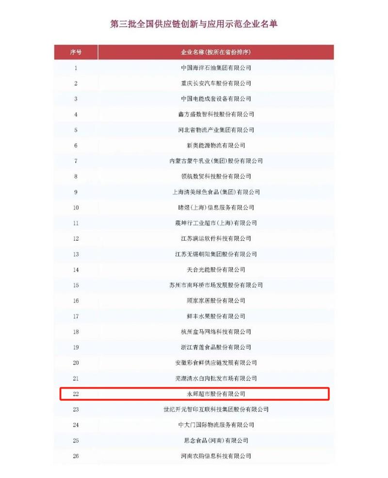 近日,經商務部等8單位單位審核及社會公示,第三批全國供應鏈創新與應用示范城市及示范企業名單公布,永輝超市榮譽入選第三批全國供應鏈創新與應用示范企業名單。 ...