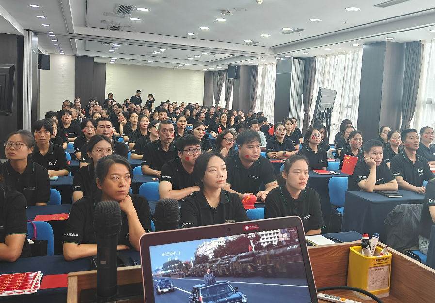 閱兵式開始后,員工們全神貫注,感受人民軍隊的威武雄壯、國之重器的磅礴氣勢,現場跟唱國歌,多次響起自發掌聲和歡呼,民族自豪感與企業榮譽感在每一位員工心中激蕩。