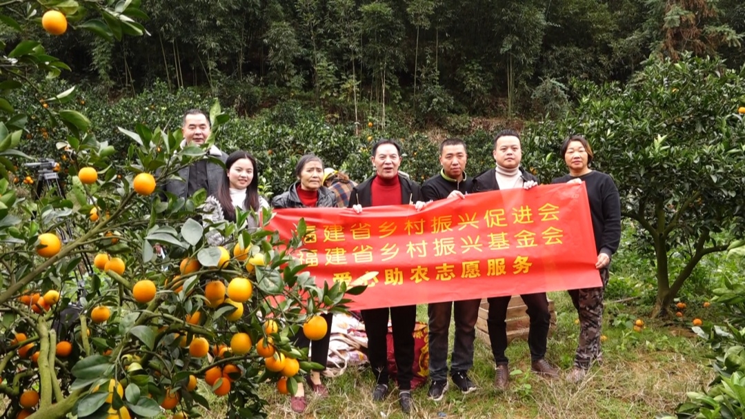 果園里橙香四溢,黃澄澄的臍橙掛滿枝頭,工人們嫻熟的將臍橙摘下。果樹下,幫助朱招弟與永輝牽線搭橋的愛心人士游厚壽也來看望朱招弟一家。